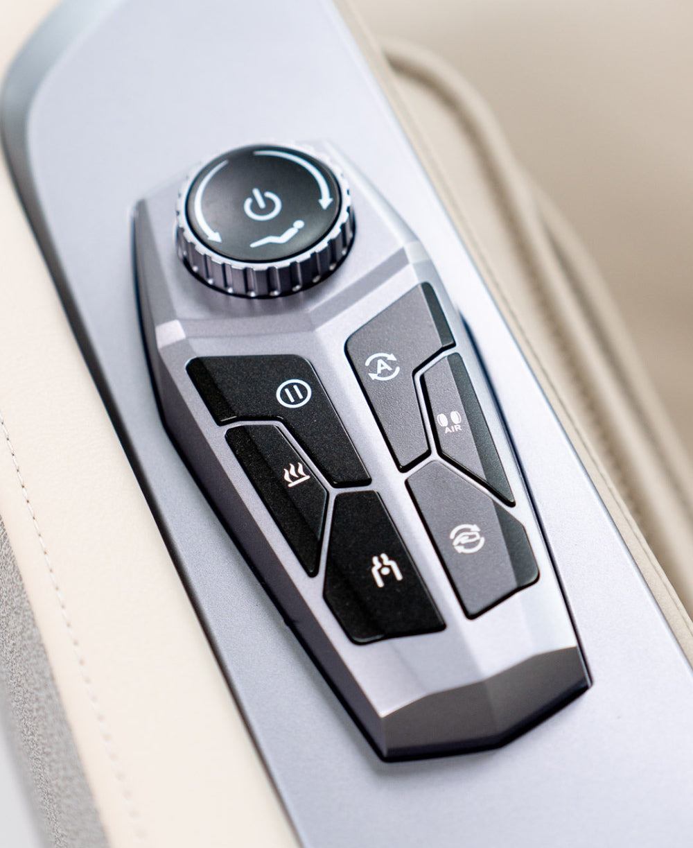 Na panelu znajdziesz włącznik zasilania, pokrętło regulacji pozycji fotela, przycisk pauzy, bezpośredni dostęp do automatycznych programów masażu, włącznik / wyłącznik funkcji takich jak: ogrzewanie i kompresja, przycisk wyboru obszaru masażu i przycisk ustawień manualnych masażu.