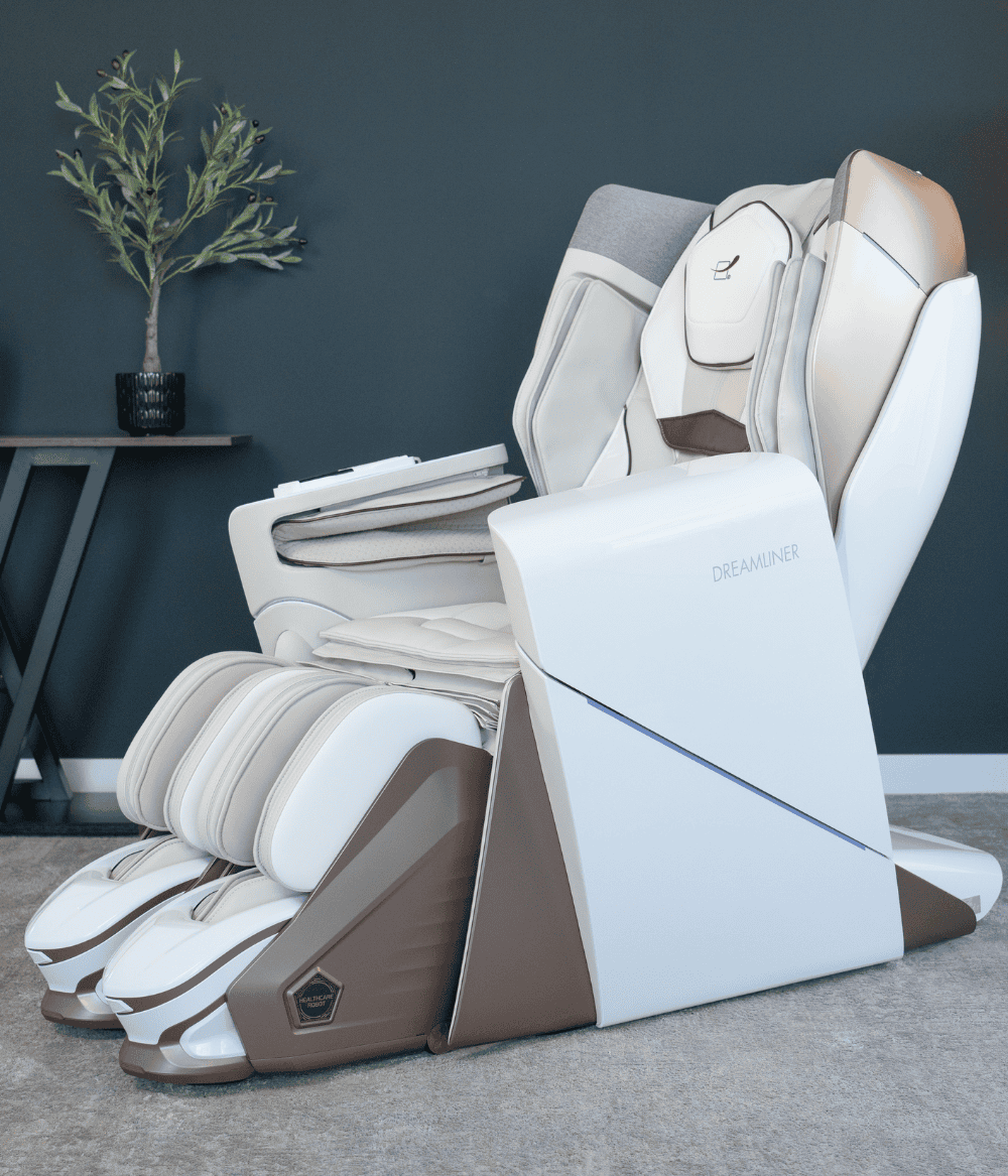 Tym, co wyróżnia fotel masujący Dreamliner już na pierwszy rzut oka jest podnóżek. Wyposażony jest on w system automatycznego dopasowania odległości podnóżka do wzrostu użytkownika, ale przede wszystkim składa się on z dwóch niezależny jednostek do masażu nóg.