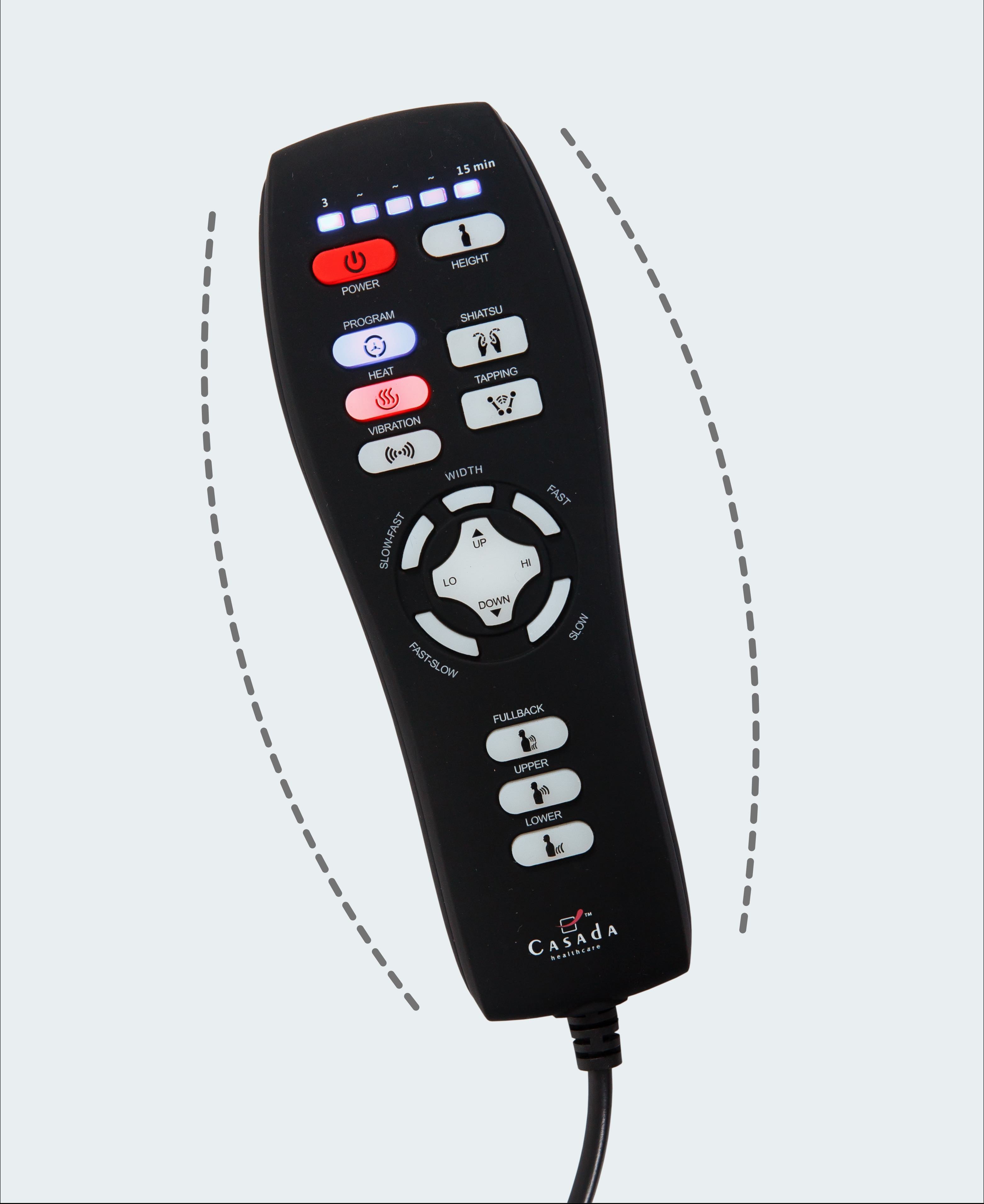 Zachowane zostały takie funkcjonalności pilota, jak uruchamianie wybranej techniki masażu, obszaru masażu, szerokości rozstawu głowic masujących, ogrzewania i wibracji. Dwie ostatnie funkcje można uruchomić i wyłączyć w dowolnym momencie trwania masażu. Do nich doszła regulacja wysokości masażera w trzech programach automatycznych o wiele mówiących nazwach: Wyciszenie, Pobudzenie i Regeneracja.