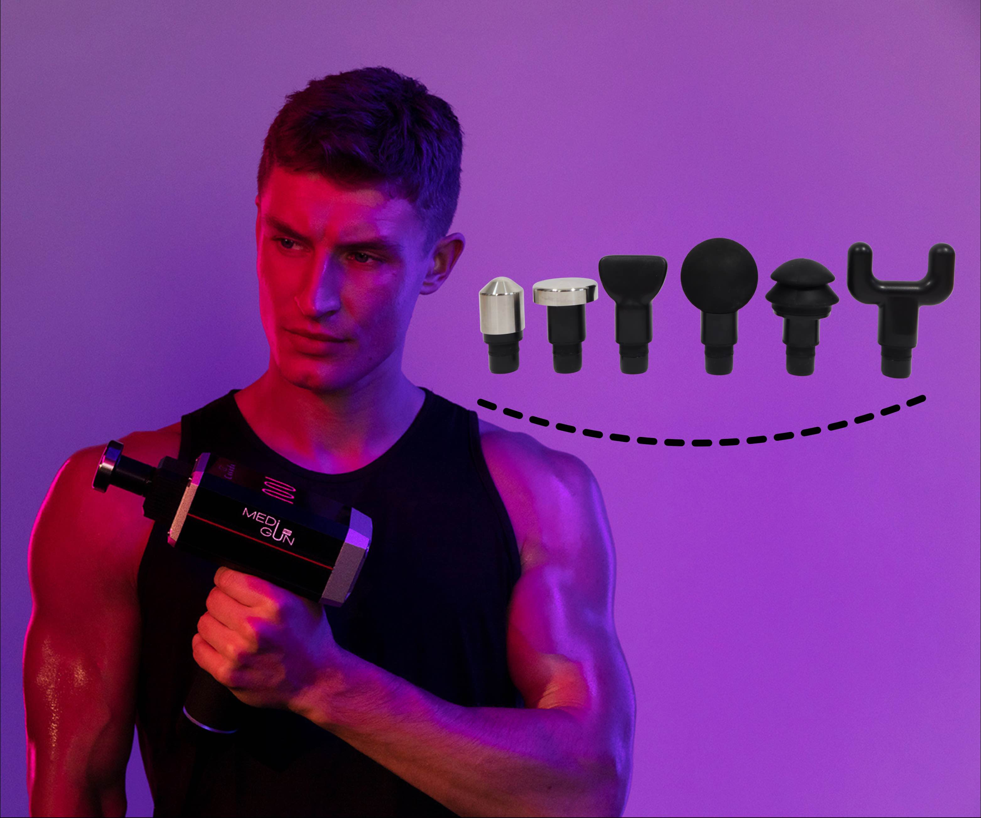Pistolet do masażu MediGunPRO posiada sześć wymiennych nasadek masujących: