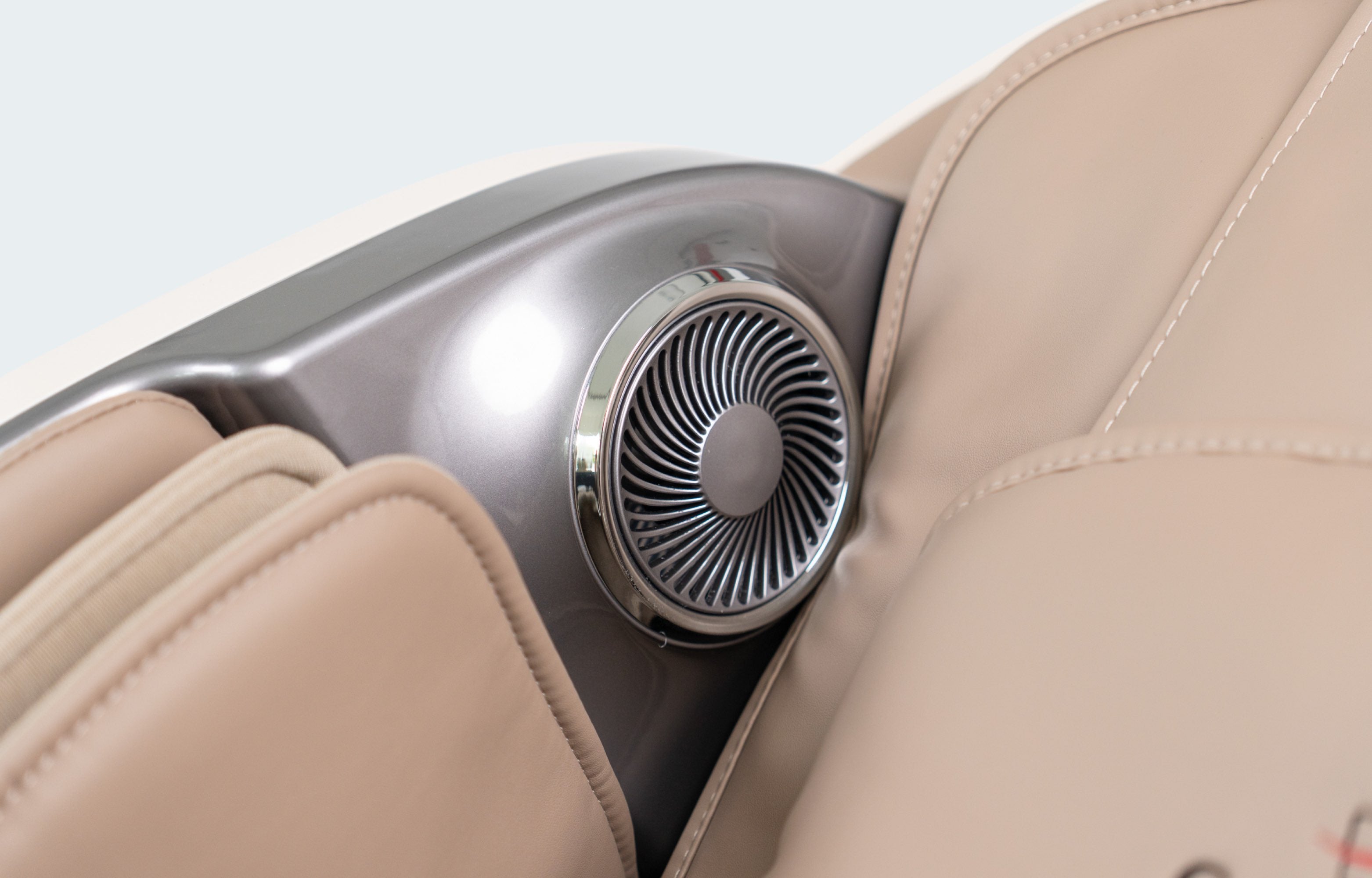 Szczyt oparcia skrywa w sobie jeszcze jedną wspaniałą technologię -wysokiej klasy głośniki.Wystarczy połączyć swój telefon z fotelem za pomocą Bluetooth, by cieszyć się ulubioną muzyką podczas masażu.