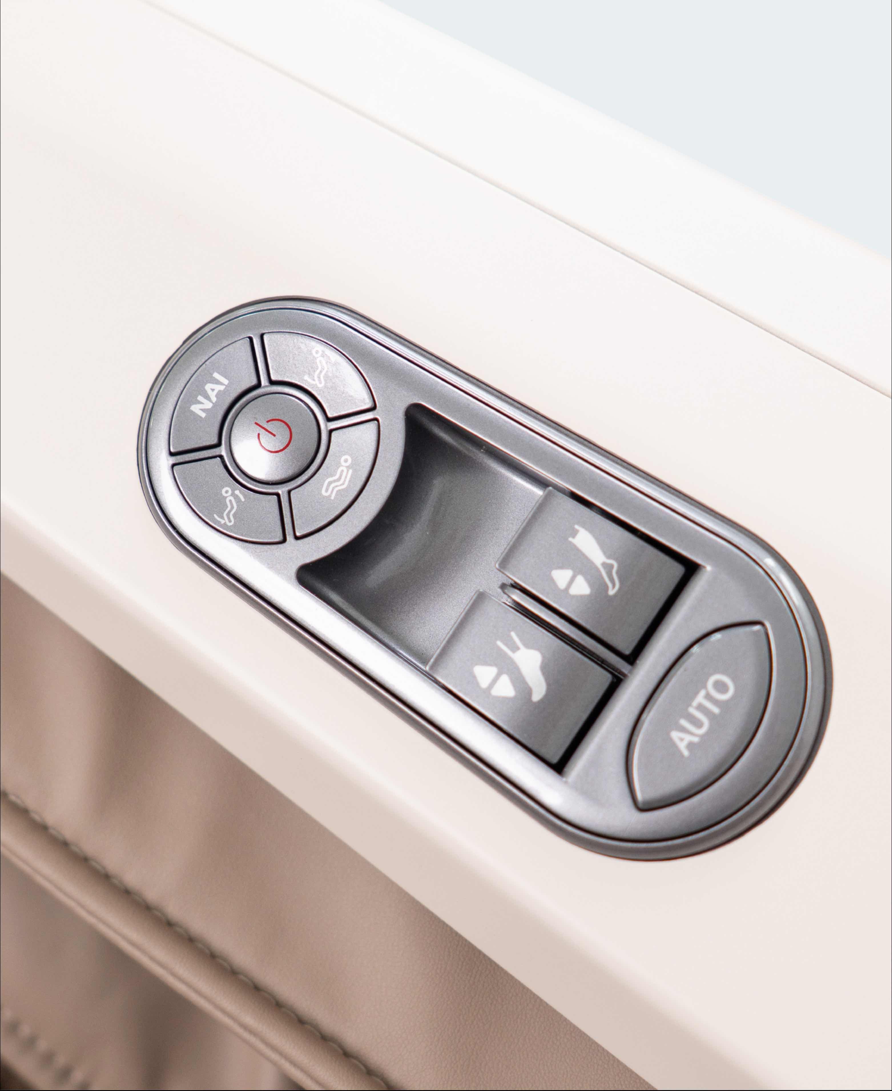 Przyciski na panelu pozwalają zmienić i dopasować pozycję fotela w trakcie masażu, poprzez regulację pozycji oparcia oraz podnóżka. Możemy więc za jednym dotknięciem płynnie przejść z pozycji siedzącej do pozycji półleżącej, czy do całkowitego rozłożenia fotela - do pozycji zero gravity, tzw. pozycji kosmonauty.